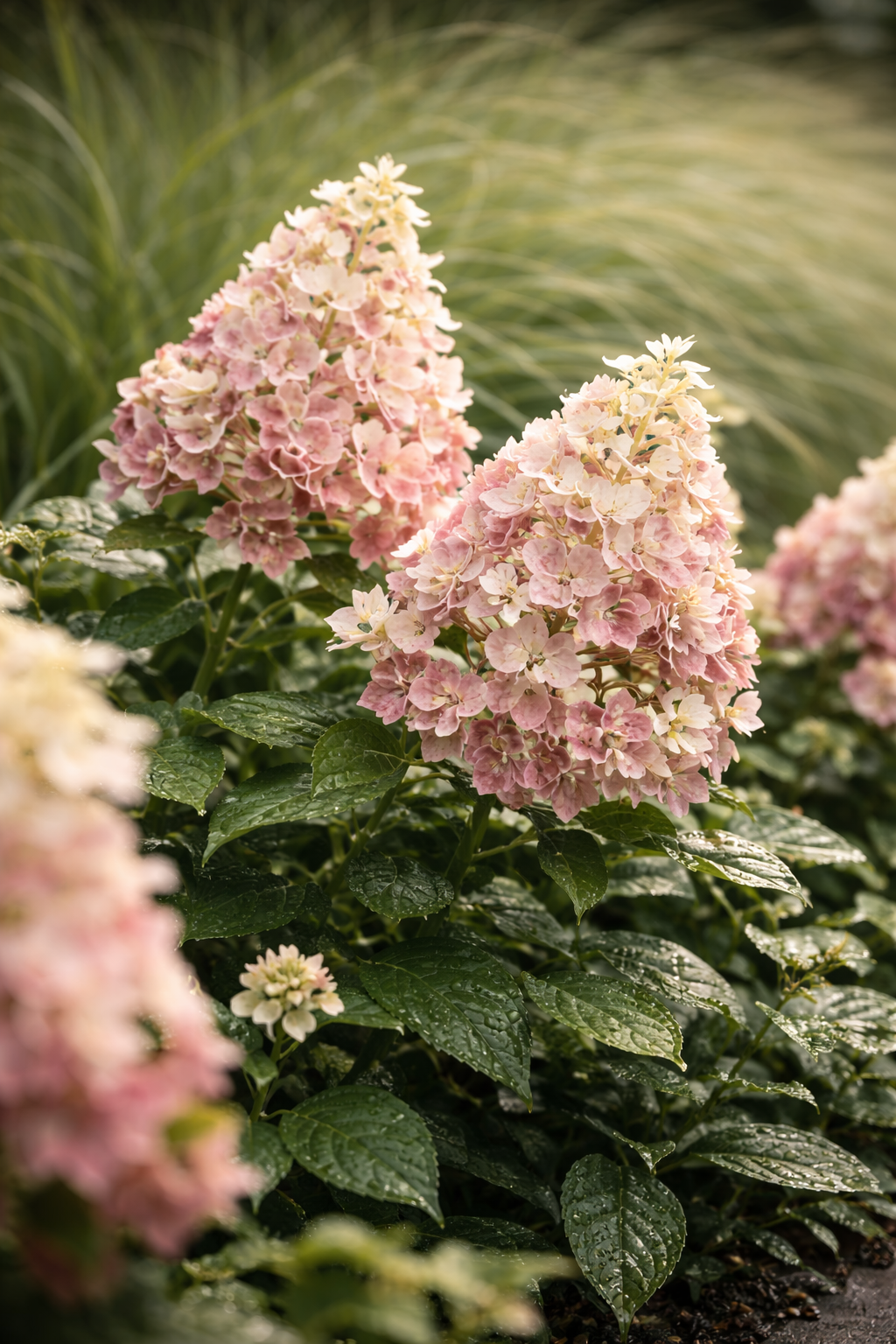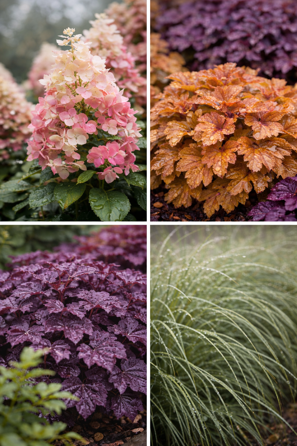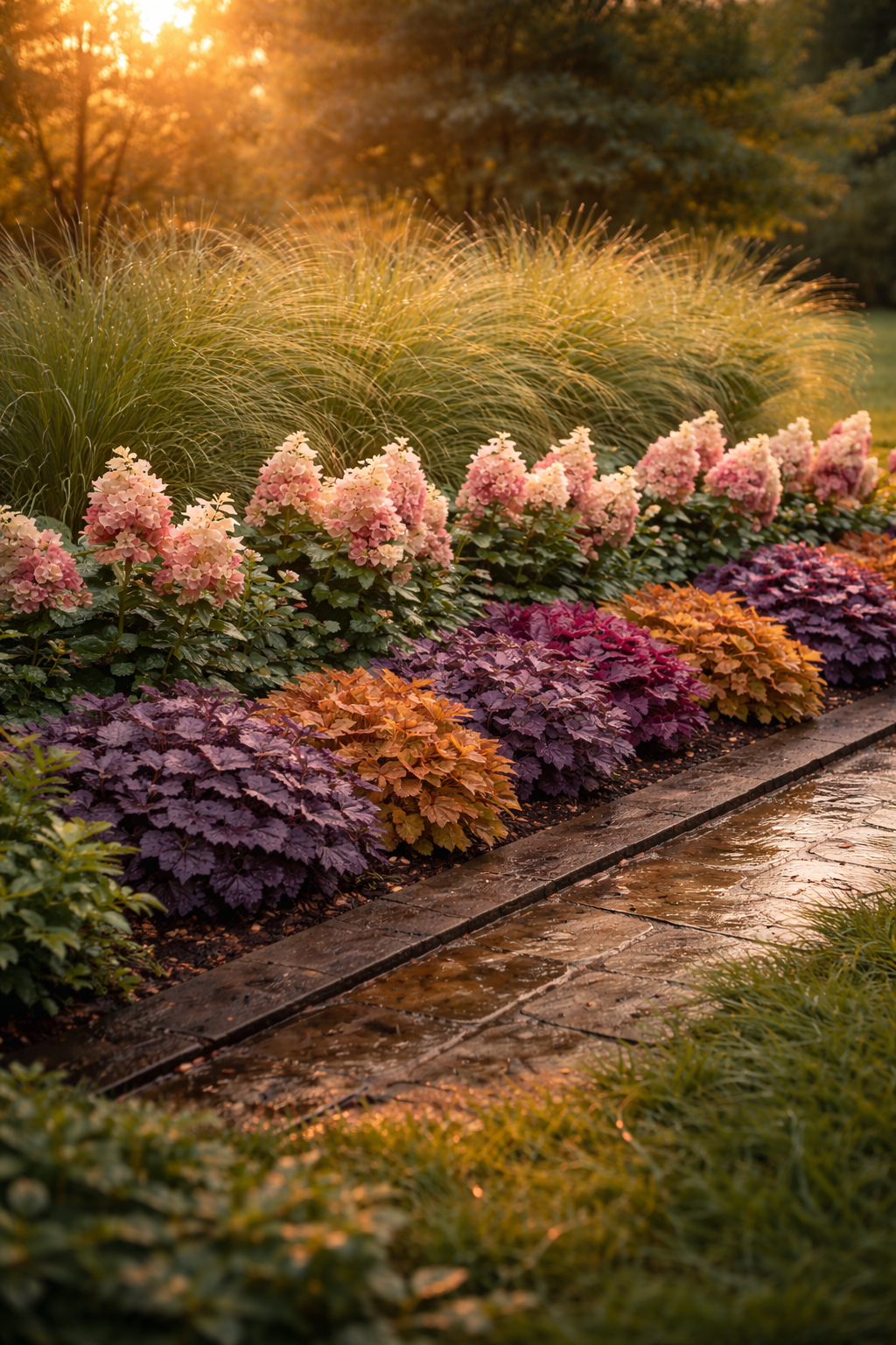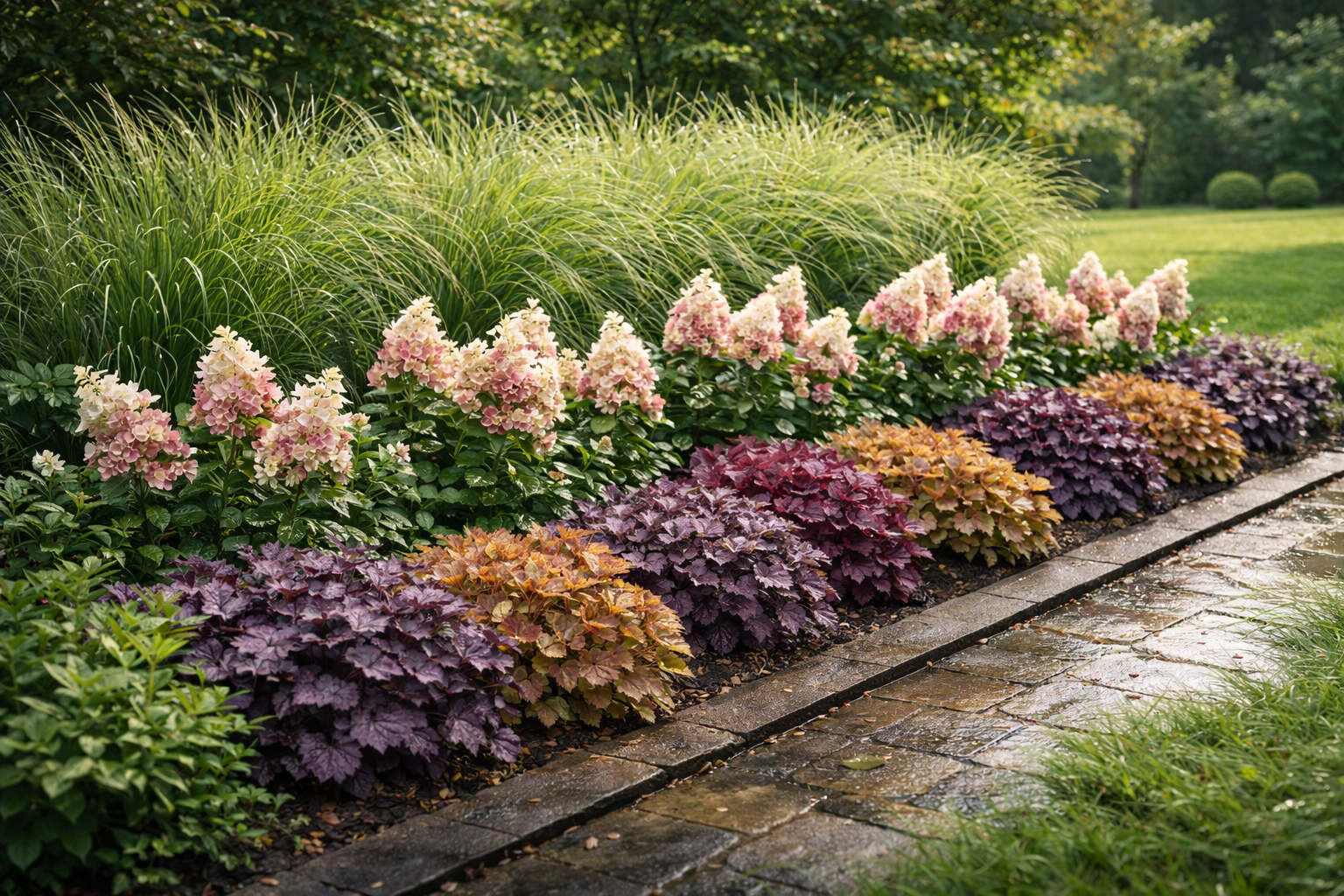 Wyraźny rytm pionów i brył – hortensje, trawy i żurawki tworzą czytelną, warstwową strukturę